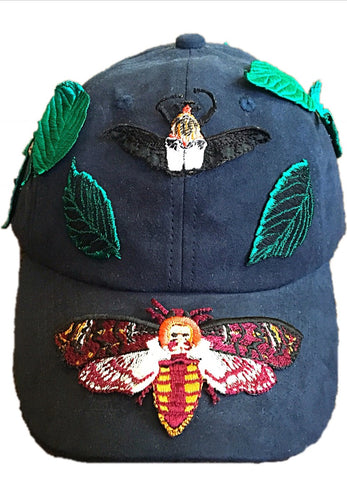 Suede baseball cap with insect application sewn.