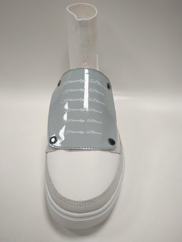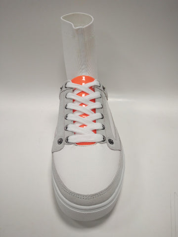 White / bone / blood orange / and silver. F.B.1 sneakers are comprised of leather, and composite materials to ensure durability, including patent leather tongue and lace guard. Lace guard includes button closures on each corner, well the ankle guard uses velcro on each side. F.B.1 sneakers feature removable lace guard and removable ankle guard.